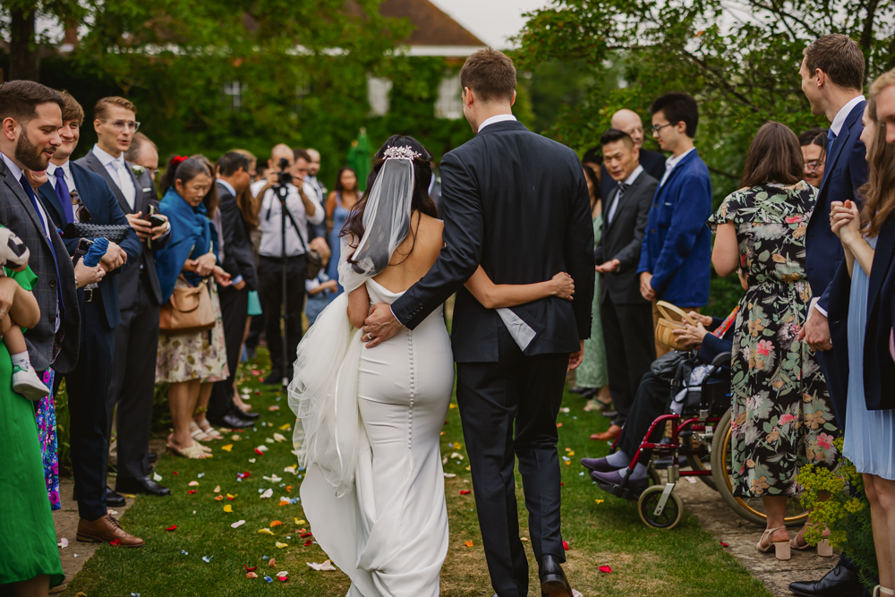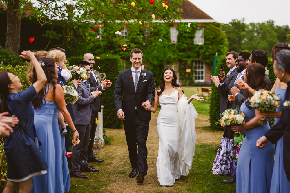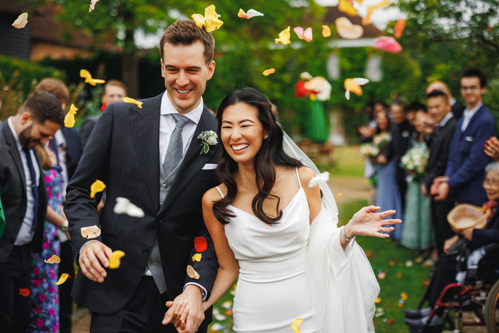 After the ceremony we gathered all the guests in the garden, lining the path for a confetti shot. Thanks to a magical combination of the confetti Harriet and Matt had bought – huge, brightly coloured petals which stood out brilliantly – and their loved ones' enthusiasm for chucking stuff at them, the results were epic!