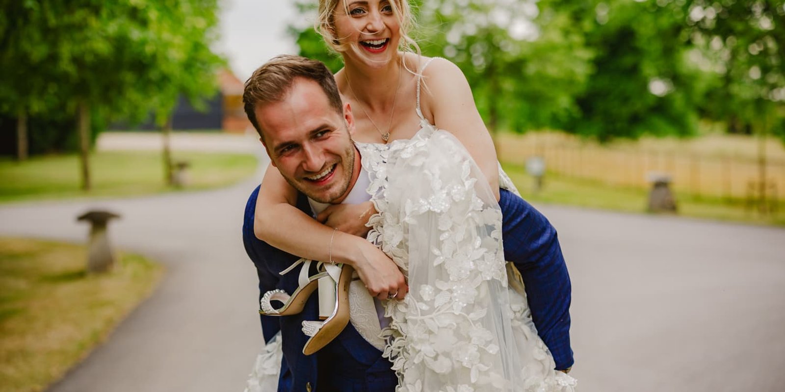 But as you can see, I'm glad to report that Jess and Elliott were super chilled during their portraits, which made for these radiant, relaxed frames. For their portrait session we went for a walk around the grounds of Wasing Park wedding venue, including in the tall grasses for some super wild, romantic vibes. Once we'd made the most of the time, the light, and the gorgeous surroundings, we began to make our way back to the Barn so the evening portion could begin. Suddenly Jess hopped on Elliott's back for a piggyback ride there – an underrated transport mode, if you ask me!